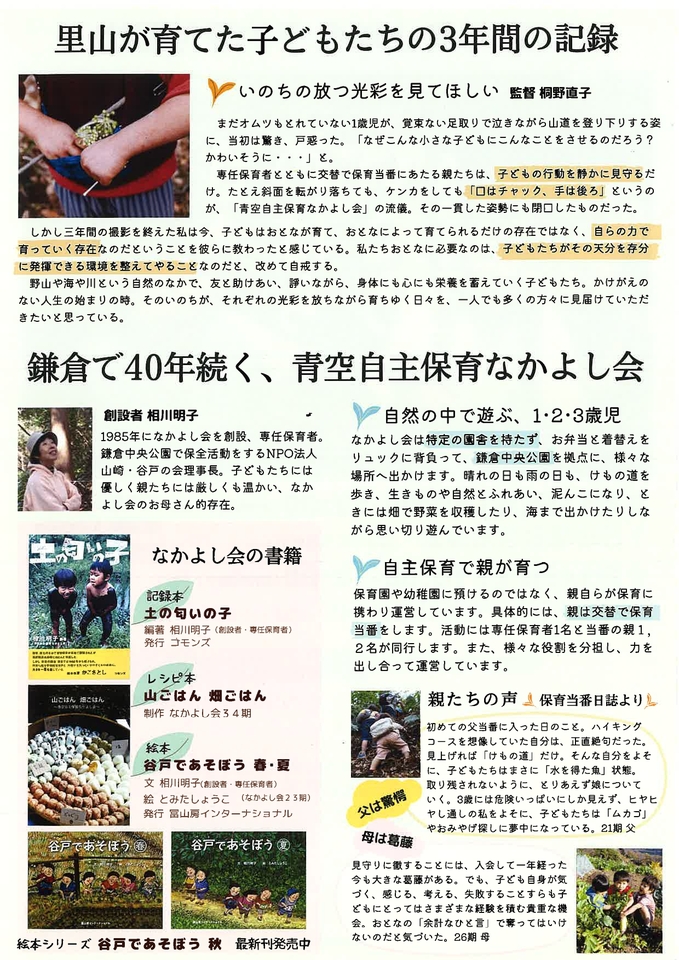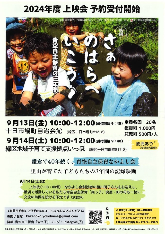 主催:青空自主保育「森っ子」「風の子」/協力:いっぽ 定員:20名 鑑賞料:1,000円 託児:あり(1歳以上の未就学児)。託児料500円/人。託児が満席の場合は、上映会場内で一緒にお過ごしいただけます(簡易キッズスペースあり)。