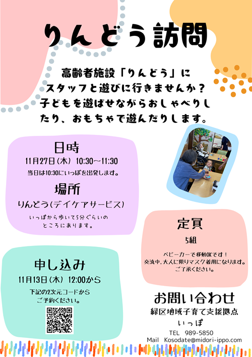 | 詳細 | いっぽの近くの高齢者施設(デイサービスルーム)に行き、おじいちゃんやおばあちゃんといっしょに遊びましょう。 要予約:5組 |
