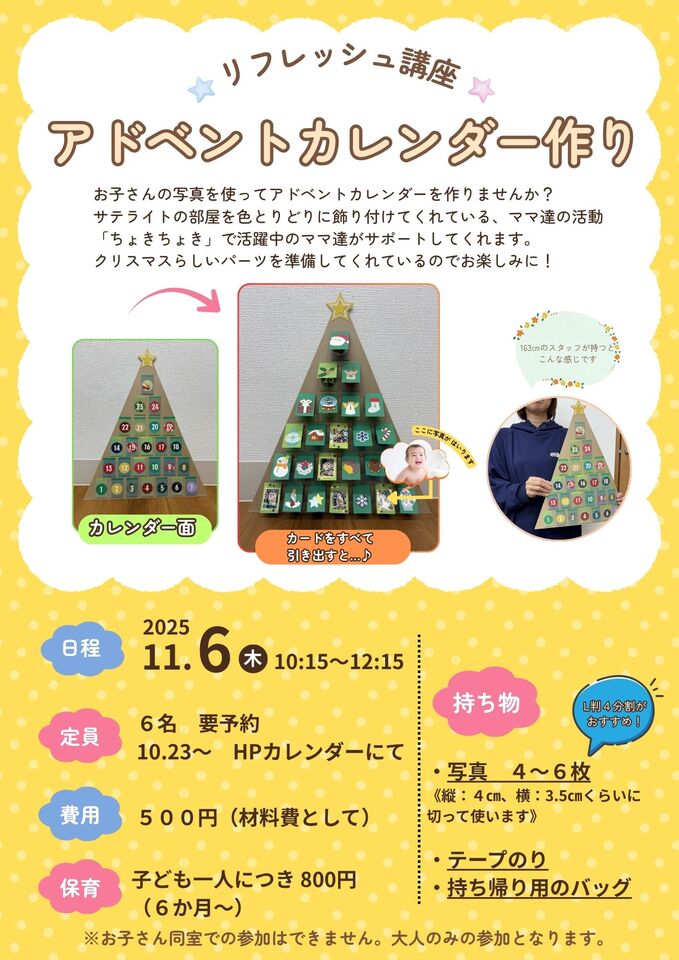 | 詳細 | お子さんの写真を使ってアドベントカレンダーを作りましょう! 定員:6名 材料費:500円 持ち物:写真 4~6枚(縦:4㎝ 横:3.5㎝くらいに切って使います) テープのり 持ち帰り用のバッグ 保育:あり(6か月~・定員6組・保育料800円) 保育票のダウンロードはこちらから ※お子さん同室での参加はできません。大人のみの参加となります。
