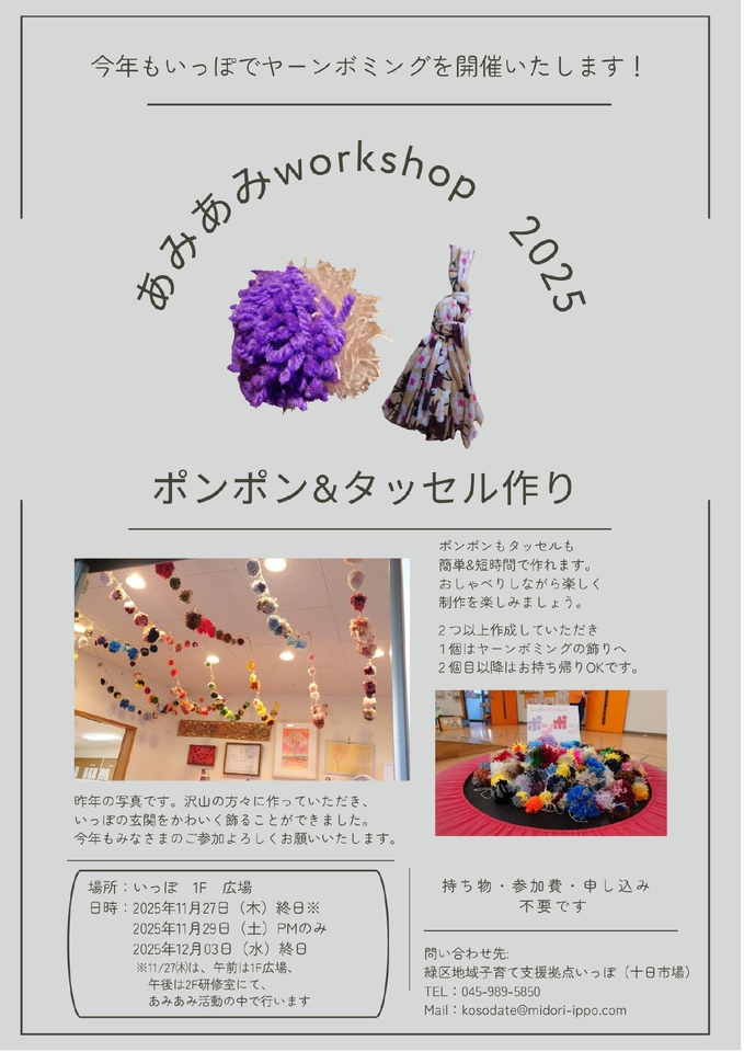 | 詳細 | いっぽ利用者ママたちの編み物グループの「あみあみ」さんといっしょに、12月に装飾予定のヤーンボミングで飾る毛糸のポンポンを作りませんか。 何個でも作れますが、1個はヤーンボミング装飾用として寄付をお願いしています。2個目以降はお持ち帰りもOK。 持ち物は不要です。お気軽に参加してください! |