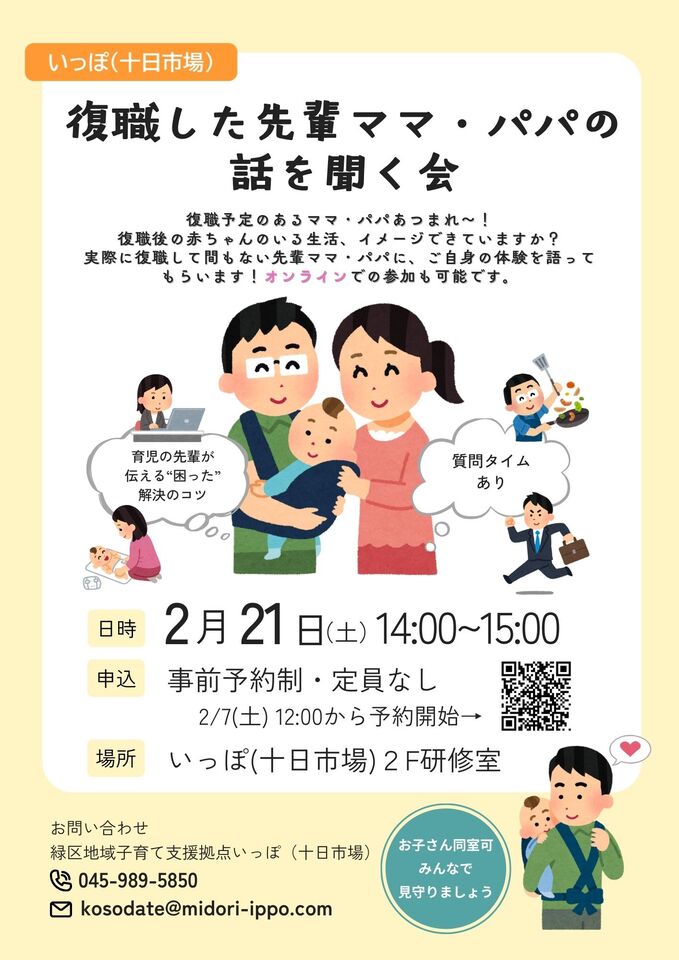 | 詳細 | 既に復職されている先輩ママパパに復職時の経験談や、今の生活の様子(家事分担・タイムスケジュール等)をうかがいます。 参加費:無料 ※お子さん同室で参加できます。 ※先輩ママパパに質問したいことがありましたら、その他・特記事項欄にご記入ください。 ※オンラインで参加希望の方は、その他・特記事項欄に「オンライン希望」と記入してお申し込みください。 申込み受付完了後、ZoomのIDとパスコードをメールにてご連絡します。(通信料は利用者負担となります) 【事前予約制・定員なし】 |