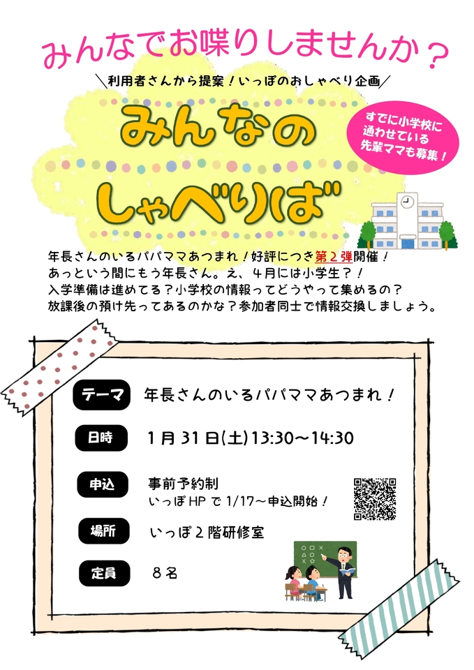 | 詳細 | 「みんなのしゃべりば」は利用者のパパママから「このテーマで他の方とおしゃべりしたい!」と提案してもらい開催するプログラムです。 今回は「年長さんのいるパパママあつまれ!~小学校入学に向けて~」です。 進学に向けて知りたいことなど、ざっくばらんにお話ししましょう! 詳細は後日アップします。 【事前予約制・定員8組】 |