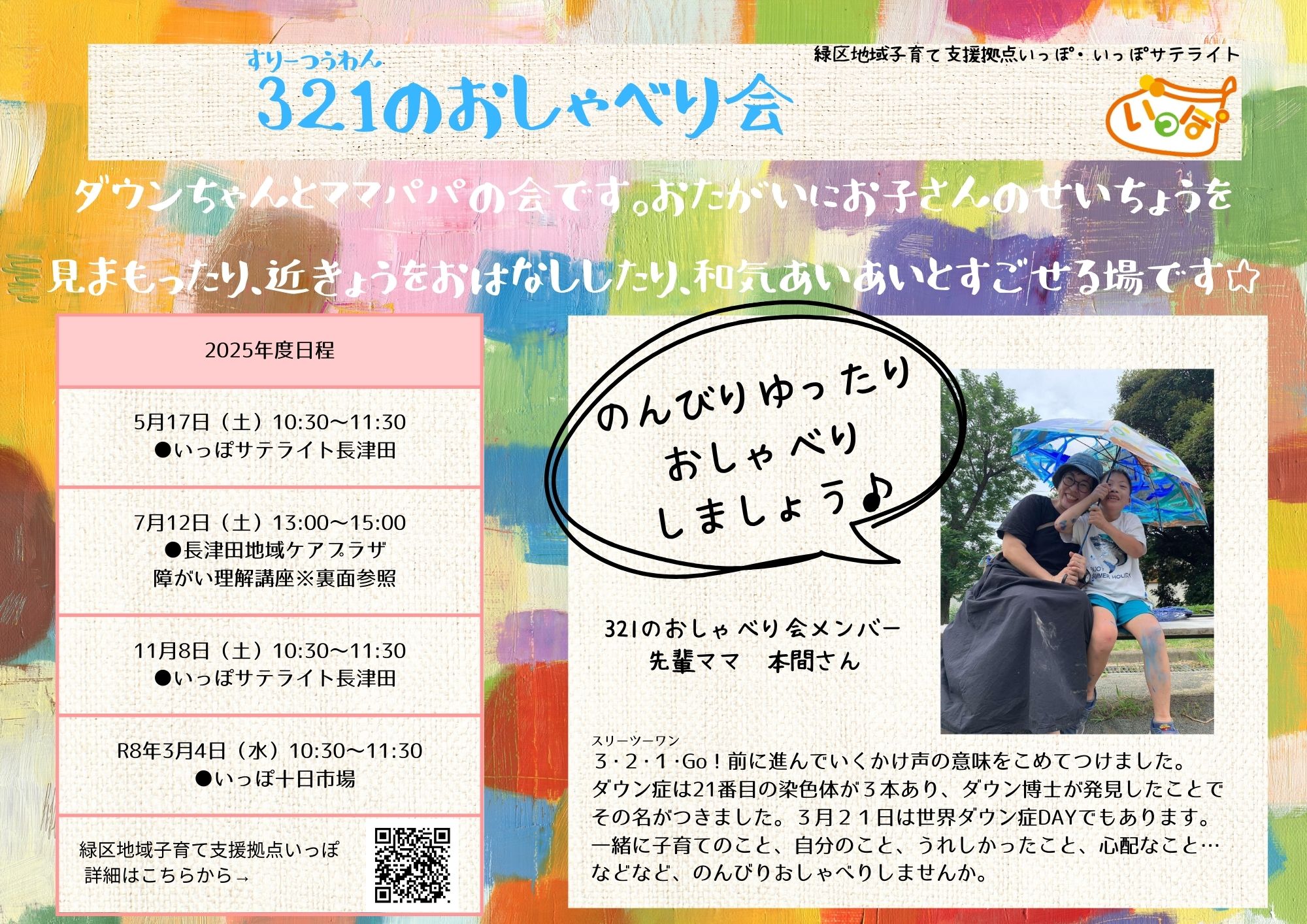 | 詳細 | 321(すりーつーわん)のおしゃべり会では、ダウン症のお子さんを持つ親御さんが、子どもの成長をお互いに見守ったり、近況をお話したり、和気あいあいと過ごせる会です。 今年度は3回開催予定です。 先輩ママが毎回一緒にお話しします。 ※321とは、、、ダウン症は21番目の染色体が3本で1本多いこと、また、3月21日が世界ダウン症DAYに由来して名付けました。ダウン症の名はダウン博士が発見したのでそう呼ばれています。 |