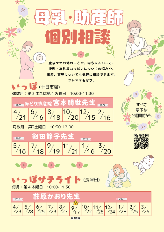 | 詳細 | 産後ママの体のことや、あかちゃんのこと、授乳・卒乳等おっぱいについての悩みや、出産、育児についても気軽に相談できます。 プレママさんもぜひ。 奇数月は、助産師の割田節子先生が来てくれます。 個別相談をご希望の方は下記の①~③の時間帯に相談室でお話しが出来ます。事前にご予約下さい。 お申込み順で相談時間が決まりますが、希望のある方は①~③を特記事項へご記入ください。ご希望に添えない場合もありますので予めご了承ください。 ①10:30~11:00 ②11:00~11:30 ③11:30~12:00 【事前予約制・定員3組・一人30分】 (乳房トラブルケア等の手当ては行いません。乳腺炎等で手当てが必要と思われる場合はお電話でご相談ください。近隣の助産院等をご紹介いたします。) ※5/2の17時以降にお申込みの方への返信は5/8(金)以降になります |