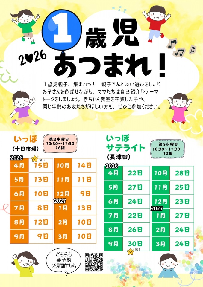 | 詳細 | 1歳児向けの遊びと、親同士でおしゃべりができる場を作ります。 2階研修室に集まれ! 【事前予約制・定員は15日(いっぽ(十日市場))は18組、22日(いっぽサテライト(長津田))は10組】 |