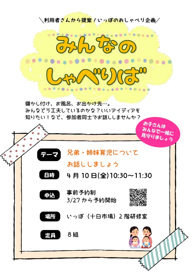 | 詳細 | ※都合により4/23(木)に延期します。ひろばで開催です。 利用者さんの提案によるおしゃべり企画、「みんなのしゃべりば」。 今回のテーマは兄弟・姉妹育児について。 寝かしつけ、お風呂、お出かけ先…。 みんなどう工夫しているのかな? いいアイデアを知りたい!など、 参加者同士でお話しませんか? 【事前予約制・定員8組】 |