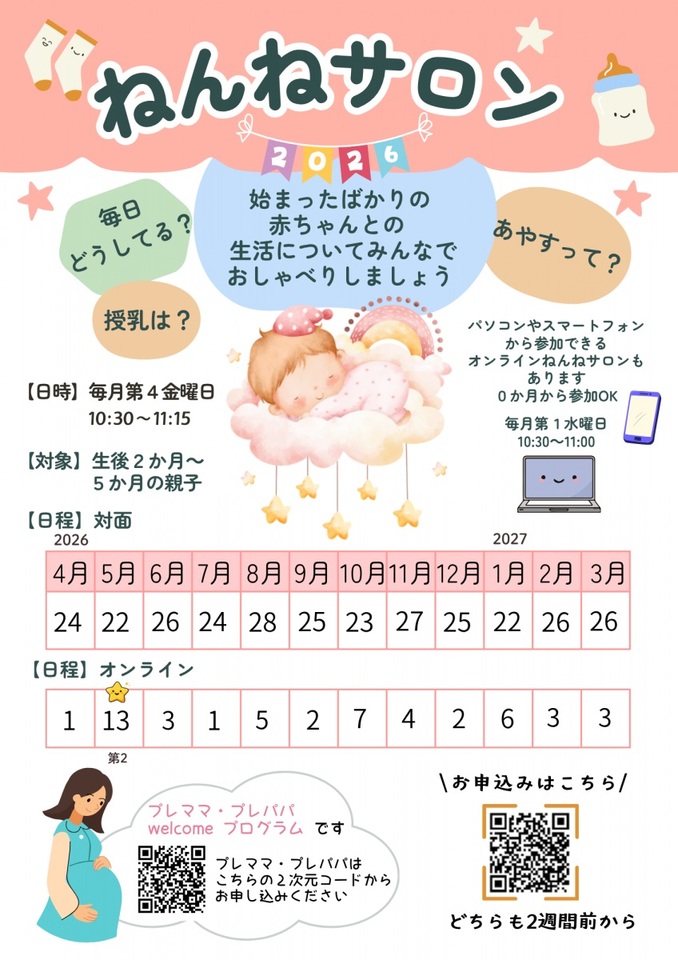 | 詳細 | 生後~5か月児と保護者対象のサロンです。 第2子以降の赤ちゃんと保護者も大歓迎! オンライン(PC・タブレット・スマートフォン)で育児のことやご自身のことなどをおしゃべりしましょう。お気軽にご参加ください。 申込受付完了後、IDとパスコードをメールにてご連絡します。(通信料は利用者負担となります)