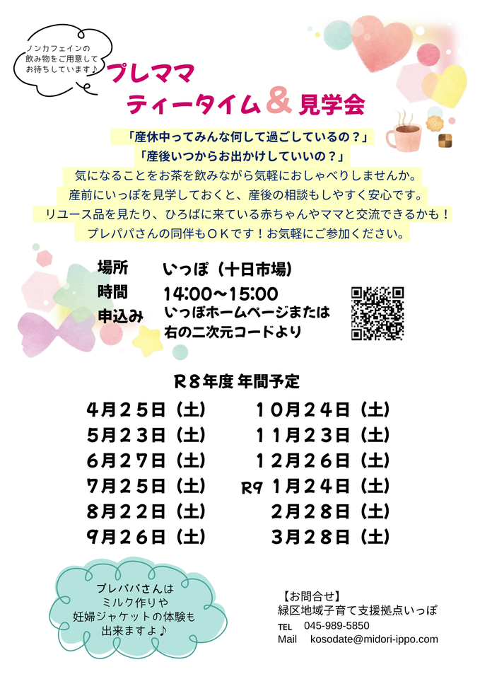 | 詳細 | 「産休中ってみんな何して過ごしてるの?」「産後いつからお出かけしていいの?」など、お茶をのみながらおしゃべりしませんか。 ノンカフェインのドリンクを用意してお待ちしています。 出産への期待、不安が高まるこの時期、のんびりとリラックスした時間は大切! 産前にいっぽ(十日市場)を見学しておくと、産後の相談もしやすく安心です。 リユース品を見たり、ひろばに来ている赤ちゃんやママとの交流もあるかも。 プレパパさんの同伴もOKです! お気軽にご参加ください。 |