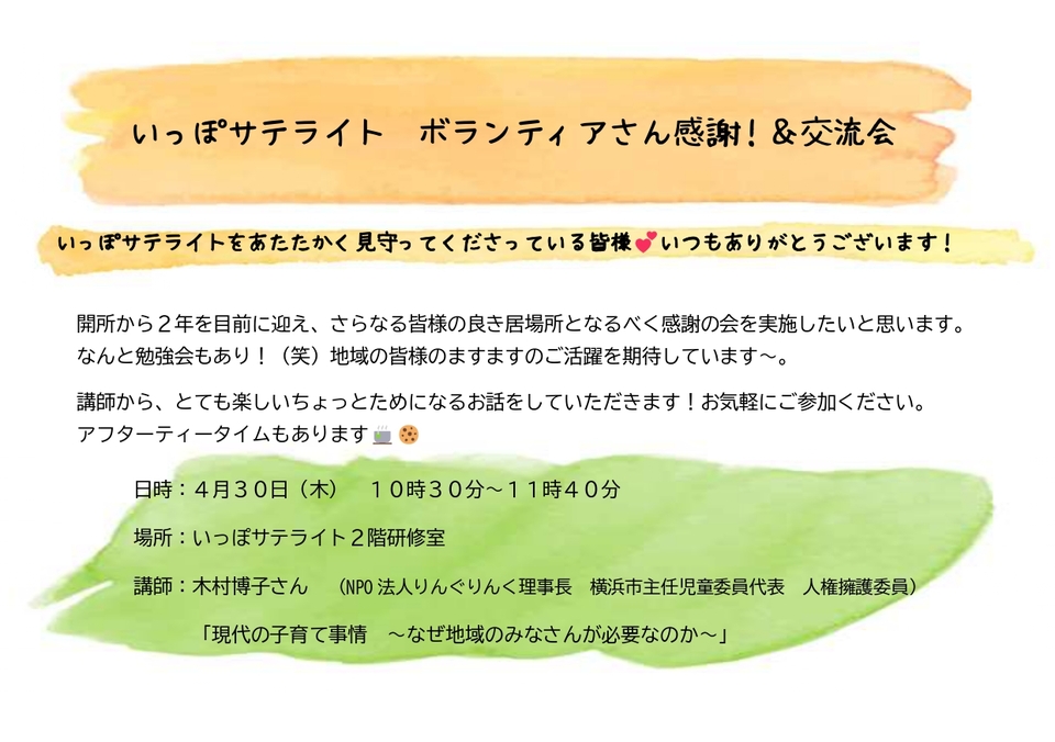 | 詳細 | (いっぽ・サテライトにボランティア登録されている方、子育てサポート提供・両方会員が対象です) 開所から2年を目前に迎え、さらなる地域の皆様の良き居場所となるべく、サテライトボランティア感謝の会を実施したいと思います。 地域の皆様のますますのご活躍を期待して、とても楽しいちょっとためになるお話もあります! 講師:NPO法人りんぐりんく代表 木村博子さん お気軽にご参加ください。 アフターティータイムもあります |